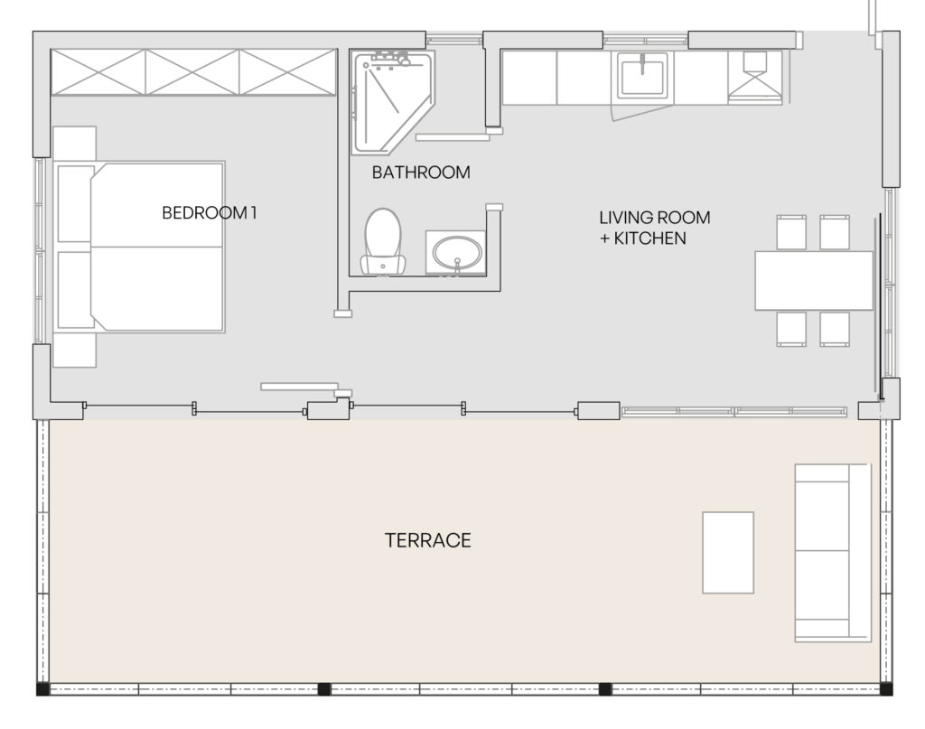 Obývací prostor s kuchyňským koutem je srdcem domu, poskytuje otevřený koncept, který podporuje společenský život a zároveň udržuje pohodlný a útulný pocit. Kuchyň je vybavena všemi potřebnými spotřebiči a je navržena pro snadné a příjemné vaření, zatímco hosté mohou relaxovat v obývacím prostoru nebo na terase.